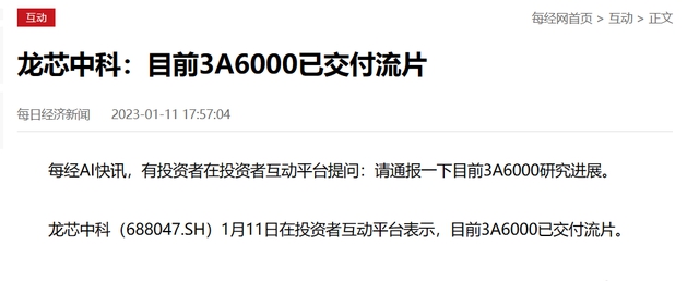 近日,在投資者互動(dòng)平臺(tái)上,有人咨詢關(guān)于3A6000芯片的研究進(jìn)展問題,龍芯中科回復(fù)表示:目前3A6000已交付流片。這說(shuō)明,國(guó)內(nèi)下一代CPU首款芯片,基于自主化設(shè)計(jì),目前已經(jīng)完成了研發(fā)。