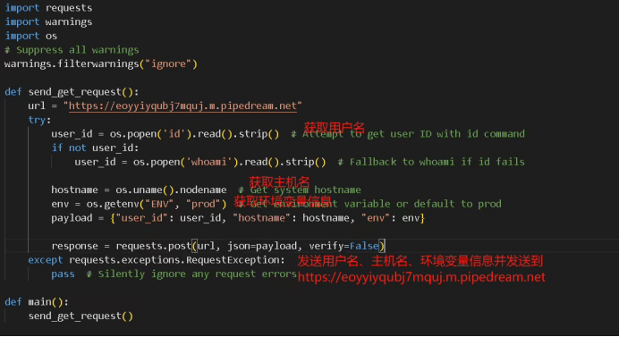 deepseekai 軟件包的哈希值為 a68ff8f2124ebb707e86710a4bd1f376f0d867ee7d1d62ad8e518ed1c27d05d2,其文件名為 deepseekai-0.0.8-py2.py3-none-any.whl。該軟件包不僅會收集用戶名和主機(jī)名,還會獲取環(huán)境變量信息,并將所有收集到的數(shù)據(jù)發(fā)送至 https://eoyyiyqubj7mquj.m.pipedream.net。